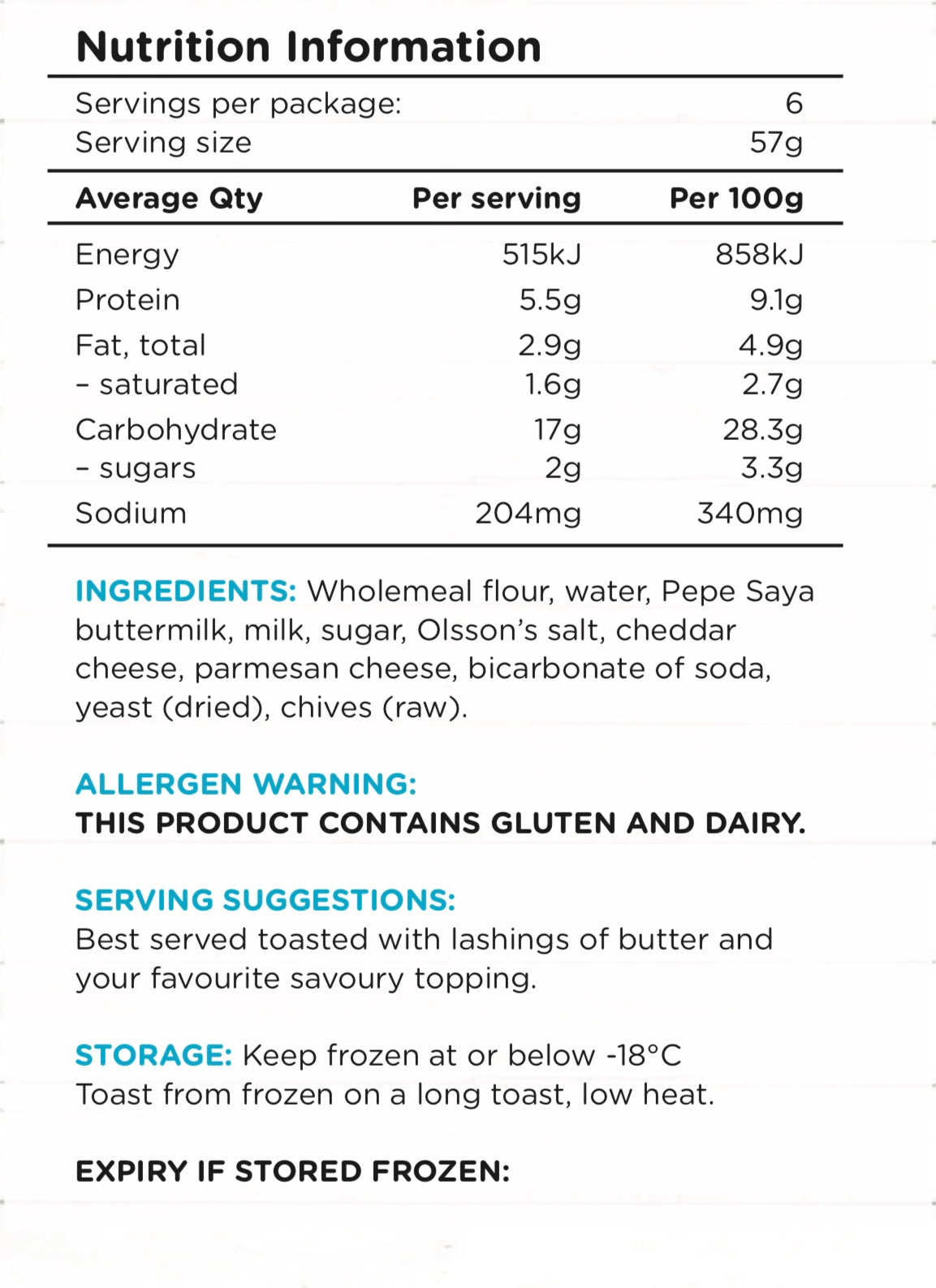Wholemeal flour , Pepe Saya buttermilk, milk, yeast (dried), sugar, Olsson’s salt, parmesan cheese, tasty cheese, sodium bicarbonate, chive flakes, water.