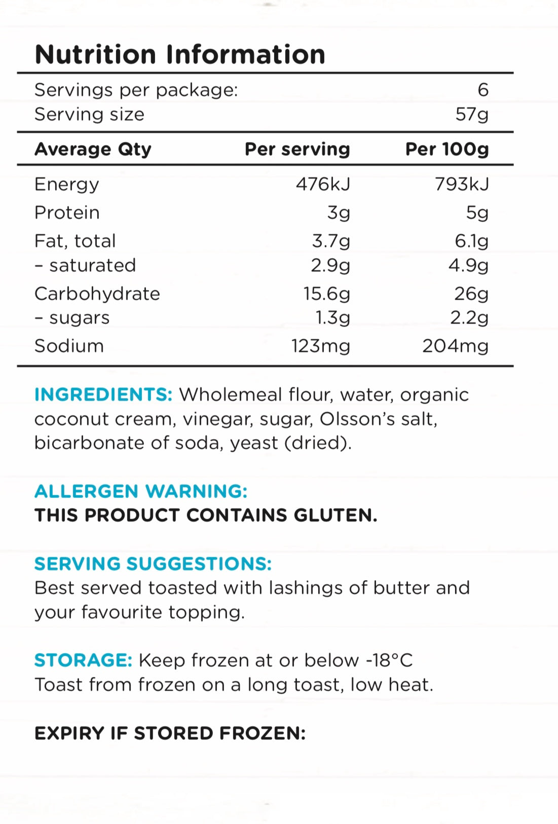 Ingredients: Wholemeal flour, coconut milk, vinegar, yeast, sugar, Olsson’s salt, sodium bicarbonate, water.