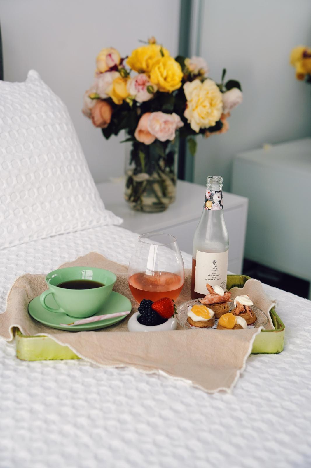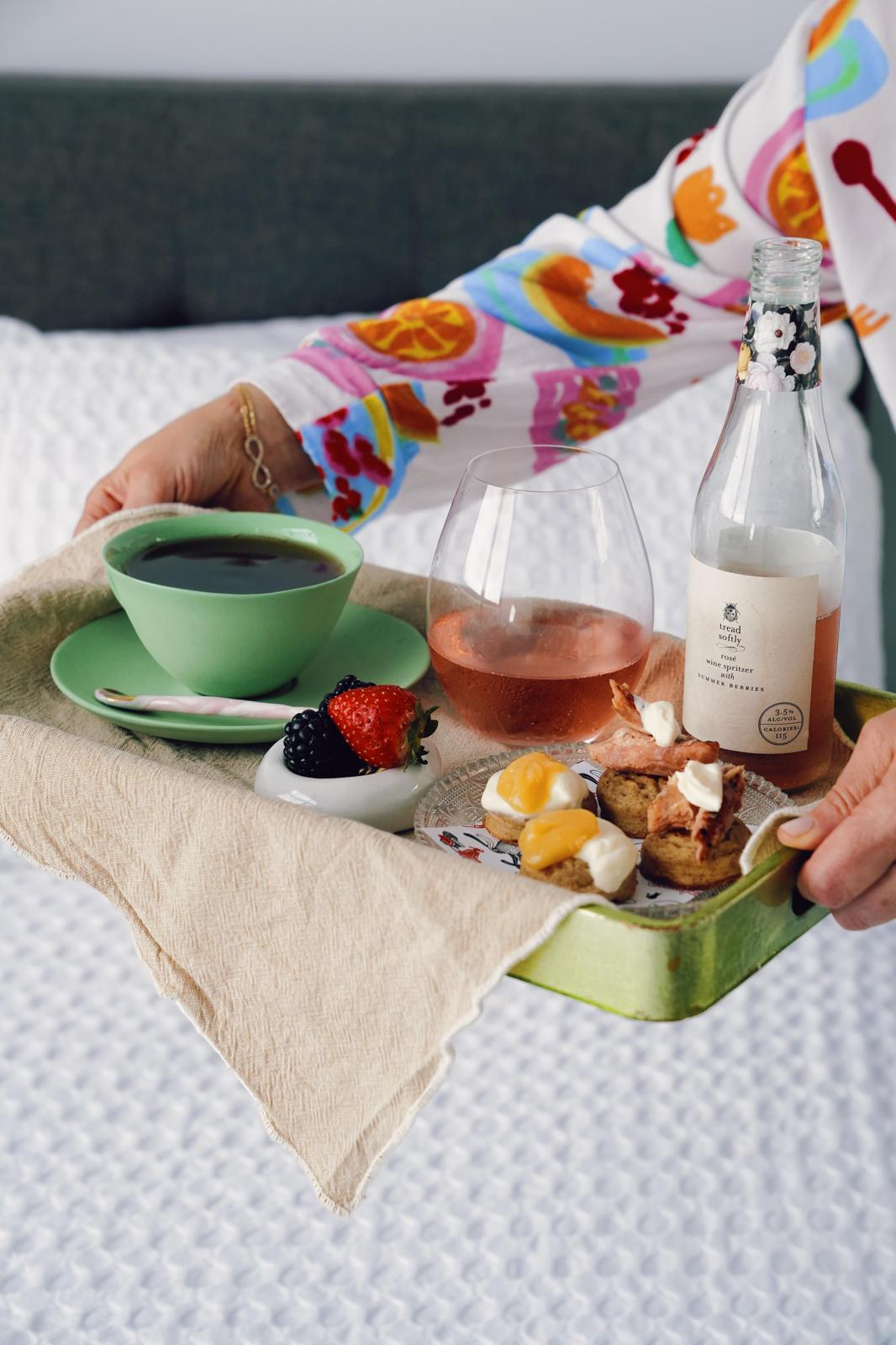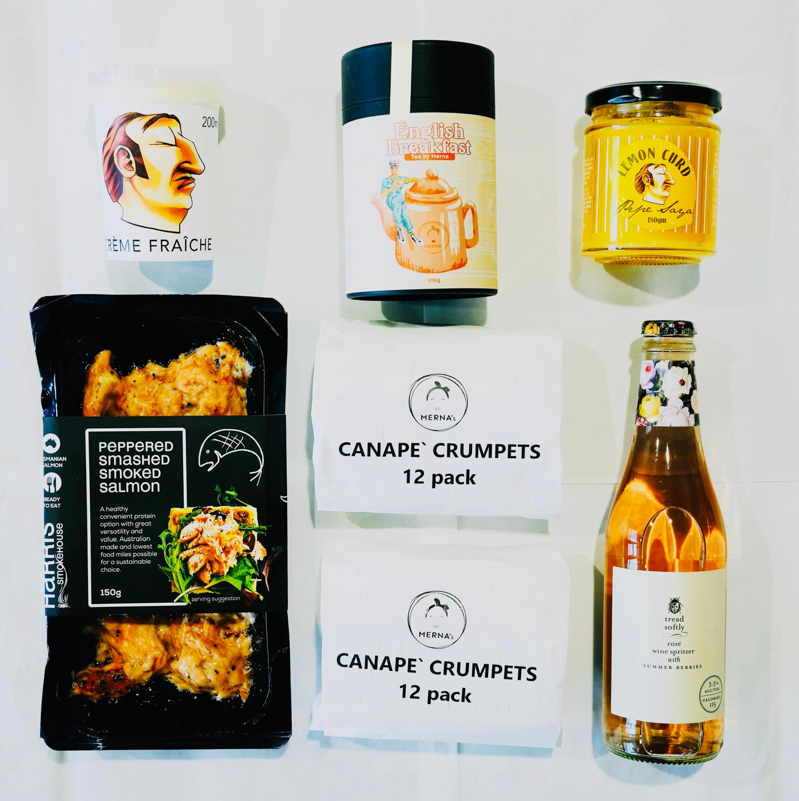 PRODUCT LIST: English Breakfast by Merna, 2 x 12 packs of Buttermilk Canape Crumpets, 1 x 150g Harris Smokehouse delicately smashed Peppered Smoked Salmon flakes, Pepe Saya Crème Fraiche, Pepe Saya Lemon Curd, Tread Softly Rose' wine spritzer with summer berries 330ml bottle. Serving Papers by Merna 6pack.