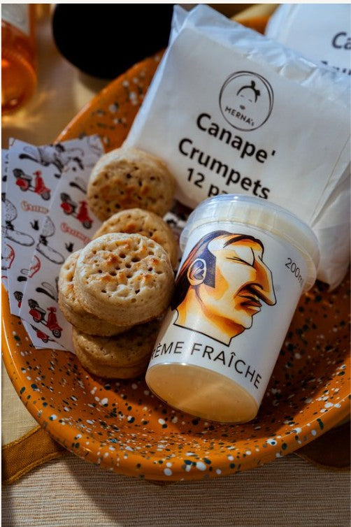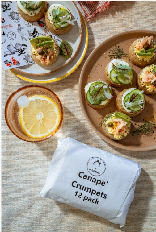 Create a sweet and savoury High Tea from the comfort of your own kitchen. Top Merna's Buttermilk Canapé Crumpets with Crème Fraiche, Lemon Curd for sweet decadence and then go savoury with delicately Peppered Smoked Salmon flakes on the same deliciously versatile Pepe Saya Crème Fraiche. Have a cup of Merna's own blend of Tea steaming hot or icy cold and/or a glass of rosé wine spritzer with berries to complete the treat!