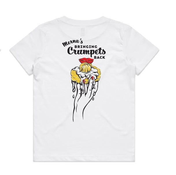 A stylish white tee featuring illustrations by Pilar Basa designed by Merna to celebrate crumpets. Screen printed by Arcade in Marrickville, NSW, this 100% cotton tee pairs perfectly with your favourite crumpet.