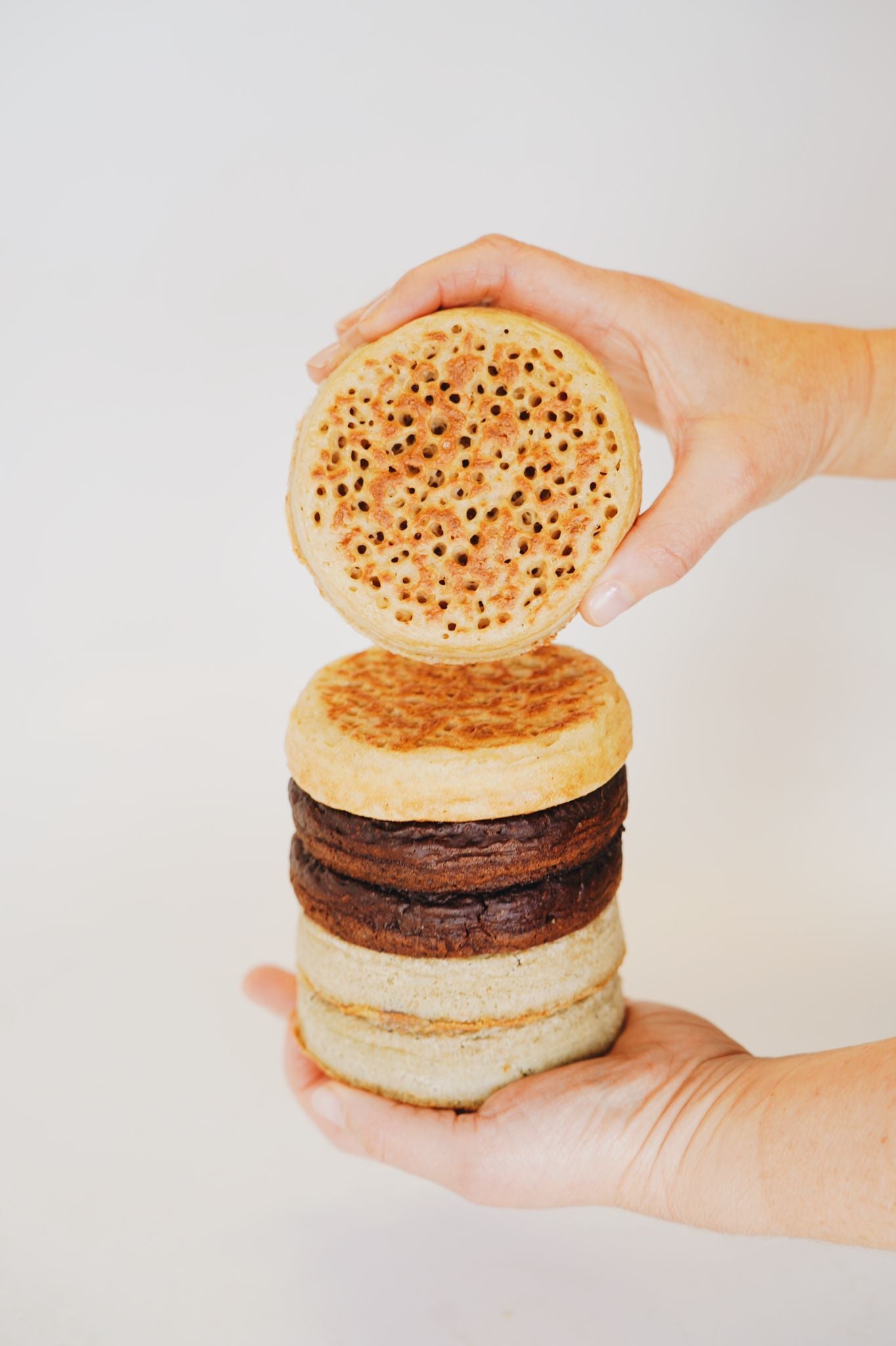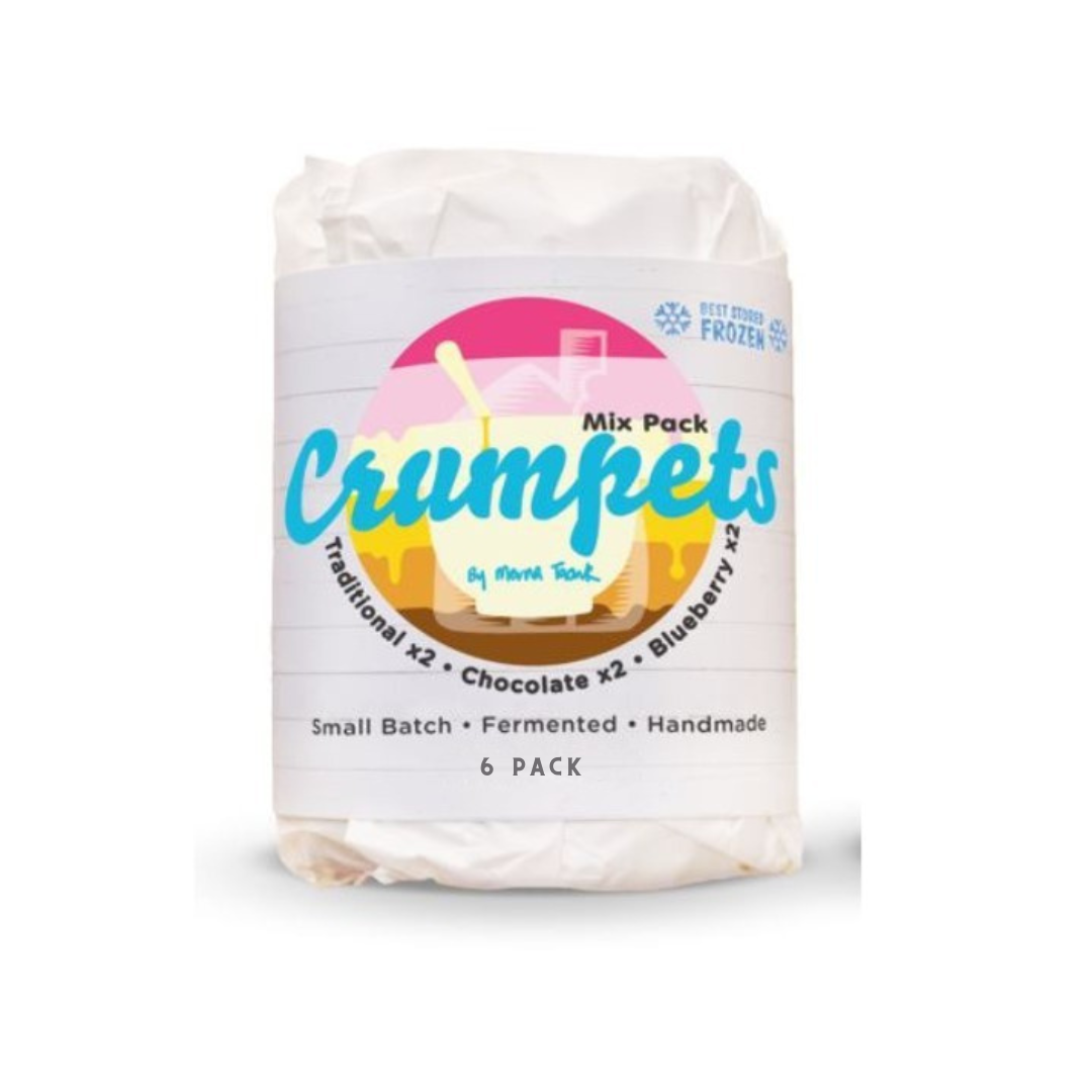 This crumpet mix pack includes 2 Traditional, 2 Chocolate, and 2 Blueberry Crumpets, offering a variety of flavours in one package.